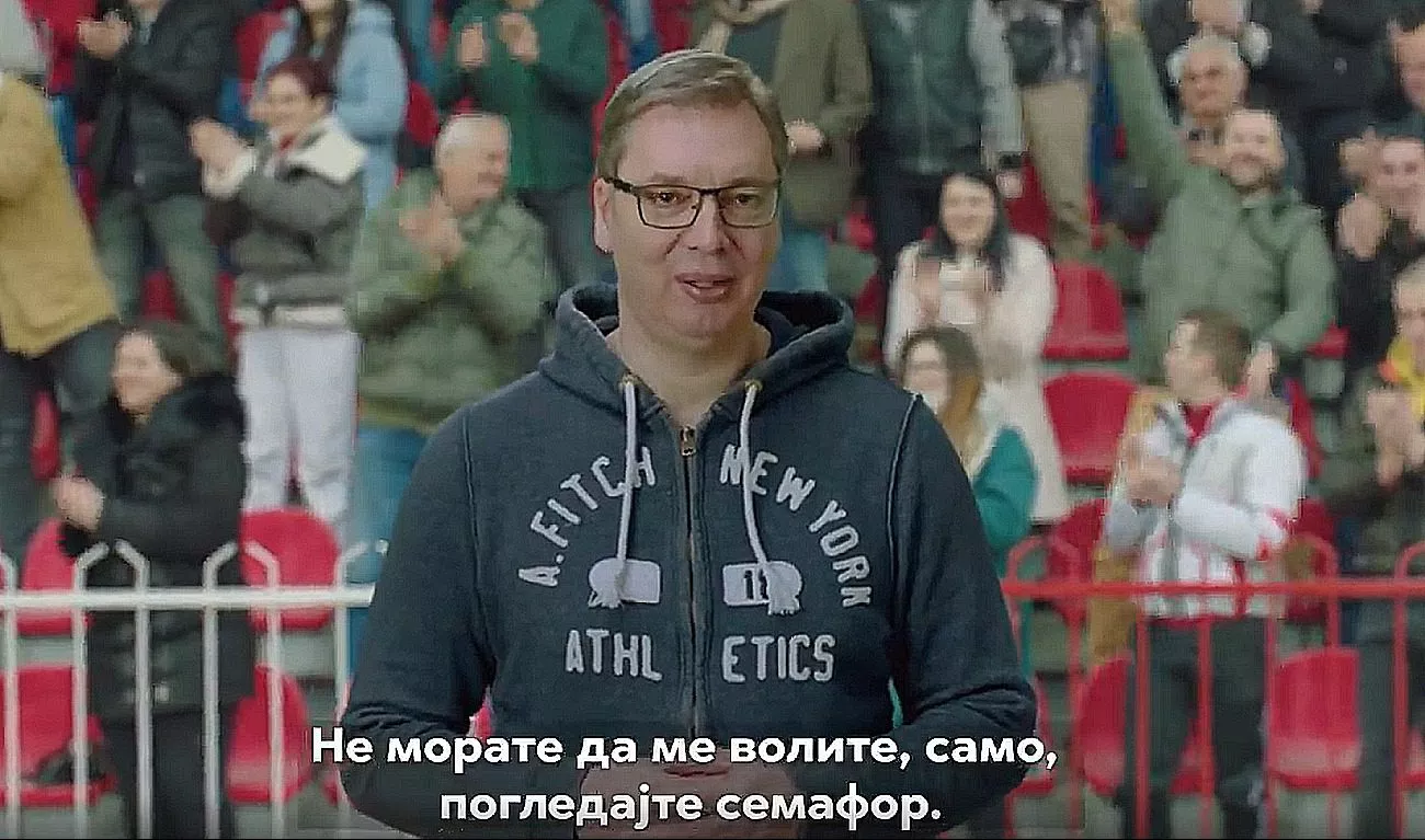 „A trener glavat? Nervira vas? Nervira i mene ali koga briga, pogledajte semafor“, izgovara jedan od glumaca a onda se pojavljuje Aleksandar Vučić.
