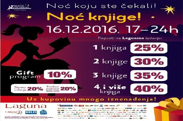 Regionalna manifestacija Noć knjige po petnaesti put biće organizovana 16. decembra od 17.00 do 24.00 časa. Noć knjige će se održati u knjižarama Delfi i Laguninim klubovima čitalaca koji se nalaze u Beogradu i u još dvadeset gradova u Srbiji.