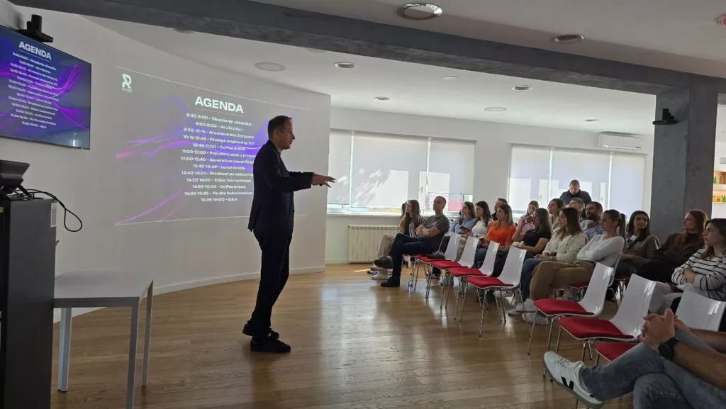 Trening su vodili Lazar Jovanović, Chief Digital & AI Officer Represent Systema, i Marija Milanović, Business Development Manager Represent Academy, dok je događaj otvorio CEO Represent Systema, dr Borislav Miljanović, podvukavši koliko je važno da kompanije strateški ulažu u digitalnu pismenost i osnaživanje zaposlenih kroz znanje koje odmah može da se primeni u praksi.