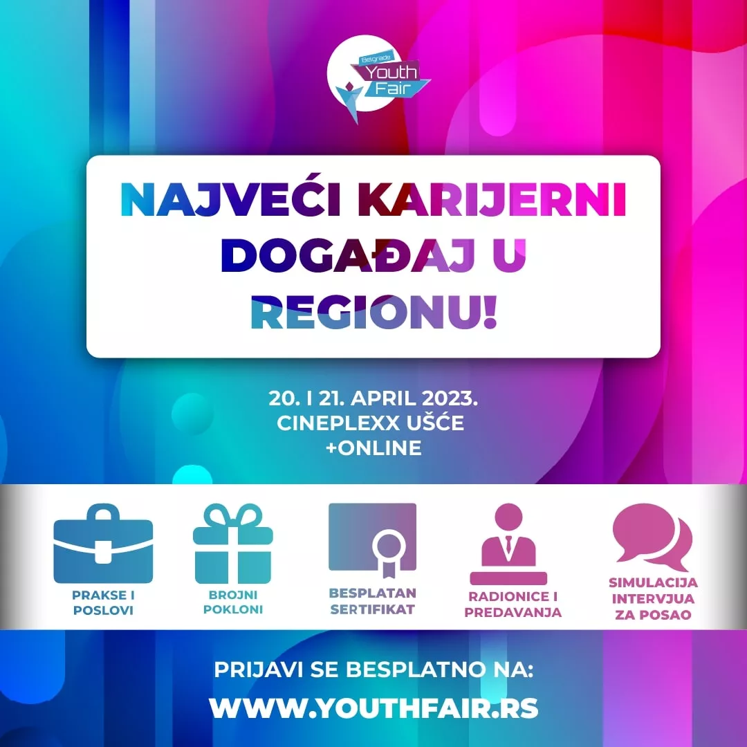 U Srbiji će se 20. i 21. aprila održati deveti po redu Belgrade Youth Fair, najveći karijerni događaj za mlade u regionu. Ove godine će biti organizovan u hibridnom formatu – u Cineplexx Ušće ali i online. Mladi će i ove godine imati priliku da se povežu sa mnogobrojnim poslodavcima i tako sebi obezbede praksu ili zaposlenje, ali i steknu mnogobrojna znanja za koja će dobiti besplatan sertifikat. Program će trajati od 10 do 16 časova, a činiće ga sajamski i konferencijski deo.