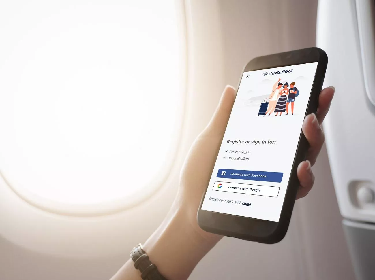 Preuzimanjem aplikacije, putnicima će na njihovim mobilnim telefonima postati dostupne funkcionalnosti, kao što su prijava na let (ček in), skeniranje pasoša, preuzimanje karte za ukrcavanje i njeno čuvanje u Wallet aplikaciji, registracija putem i-mejla, fejsbuka i gugla, podešavanje analitike i vrste poruka koje žele da primaju, dok je posebno značajna mogućnost bezbednog čuvanja putnih dokumenata.