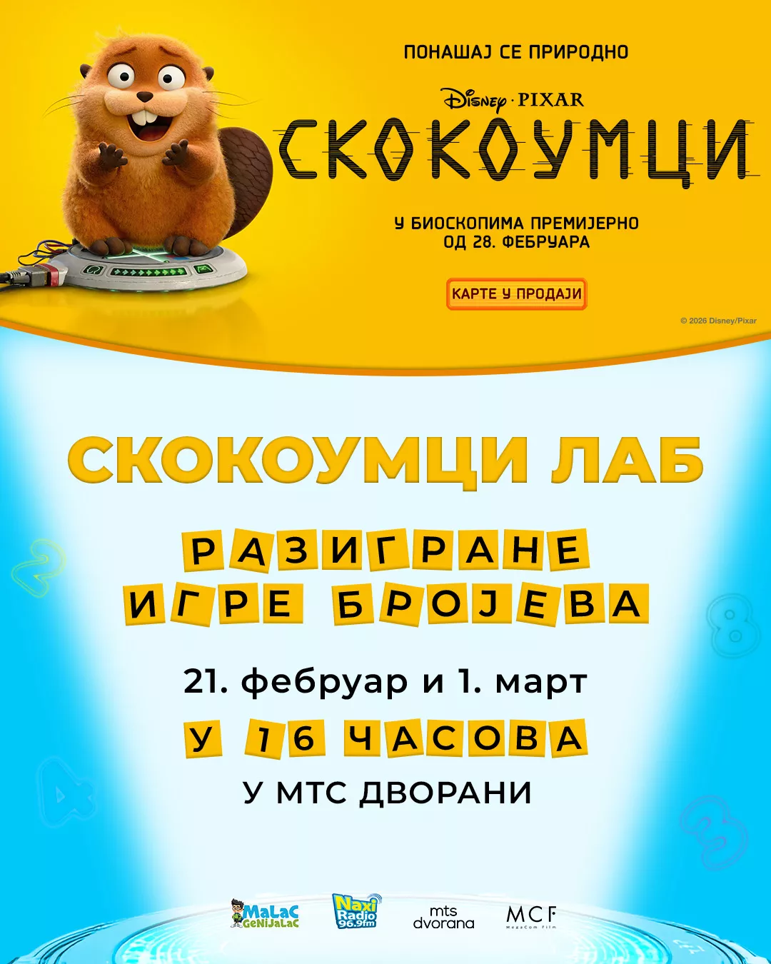 MCF MegaCom Film, i platforma Malac Genijalac pozivaju mališane da kroz igru, kreativnost i zabavne izazove upoznaju svet brojeva i ekologije. Povodom novog Disney•Pixar animiranog filma SKOKOUMCI, mališani imaju priliku da se upoznaju sa avanturama svojih omiljenih likova i na jedinstvenoj besplatnoj radionici SKOKOUMCI LAB.