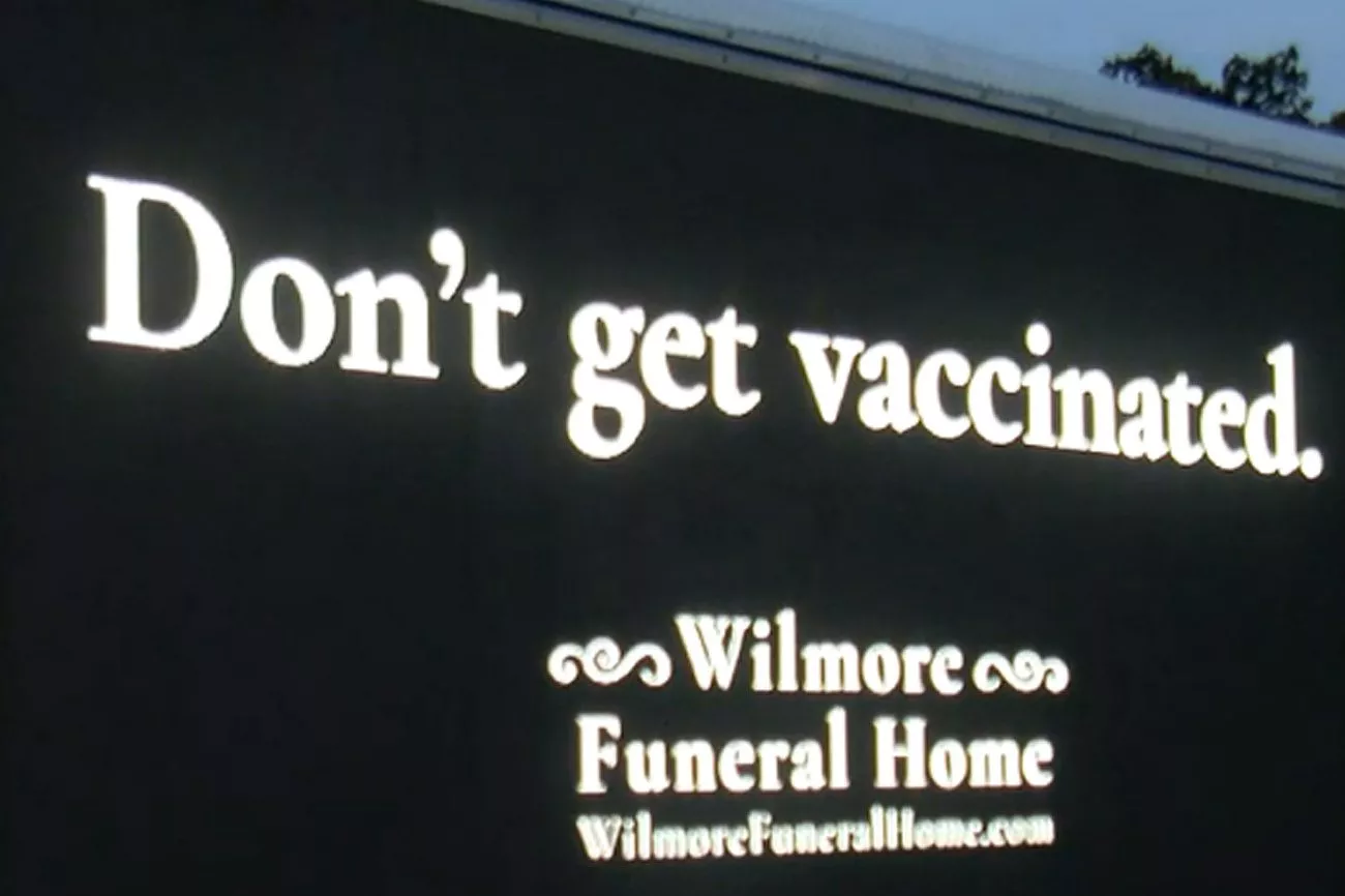 Uprkos tome što isprva deluje kao poruka neke antivakcinaške grupe, sitnim slovima ispod natpisa stoji: „Pogrebno preduzeće Vilmor“.
