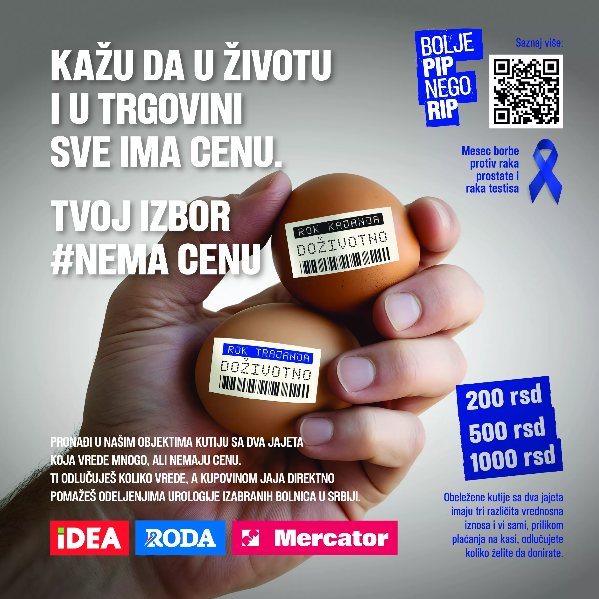 Tokom trajanja kampanje, od 28. novembra do 31. decembra, u 20 odabranih IDEA, Roda i Mercator prodavnica širom Srbije potrošači imaju priliku da podrže akciju kupovinom kutije sa dva jaja koja vrede mnogo, ali nemaju cenu. Kutije sa jajima dostupne su u 3 ponuđene opcije, a vrednosni iznos odabraće sami kupci. Sav prihod od prodaje biće doniran urološkim odeljenjima odabranih bolnica u Srbiji.