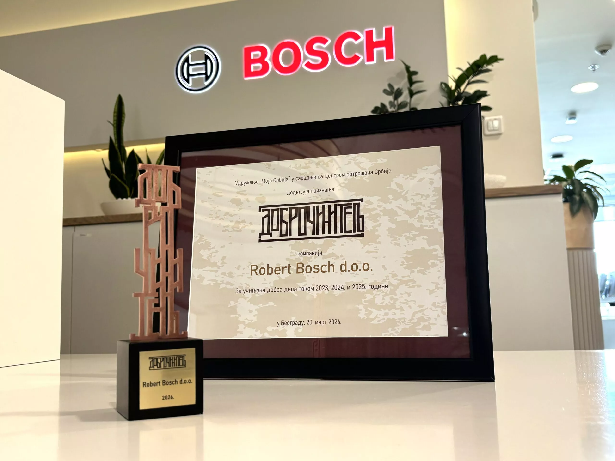 U godini kada obeležava dve decenije od osnivanja nezavisne kompanije u Srbiji, za Bosch stiže važno priznanje za sprovedene društveno odgovorne aktivnosti. U pitanju je prestižna nagrada „Dobročinitelj“ koju udruženje „Moja Srbija“ u saradnji sa Centrom potrošača Srbije dodeljuje kompanijama i pojedincima za izuzetan doprinos društvu, solidarnost i održivi razvoj.
