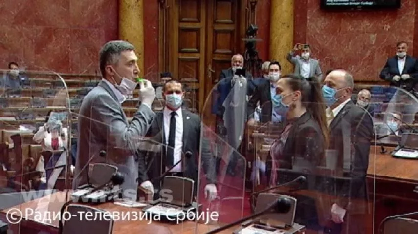 Na početku sednice Skupštine Srbije na kojoj se razmatra ukidanje vanrednog stanja narodni poslanik iz Dveri Boško Obradović je duvao u pištaljku u skupštinskoj sali uz povike „Dole vlada, dole Vučić, lopovi.“