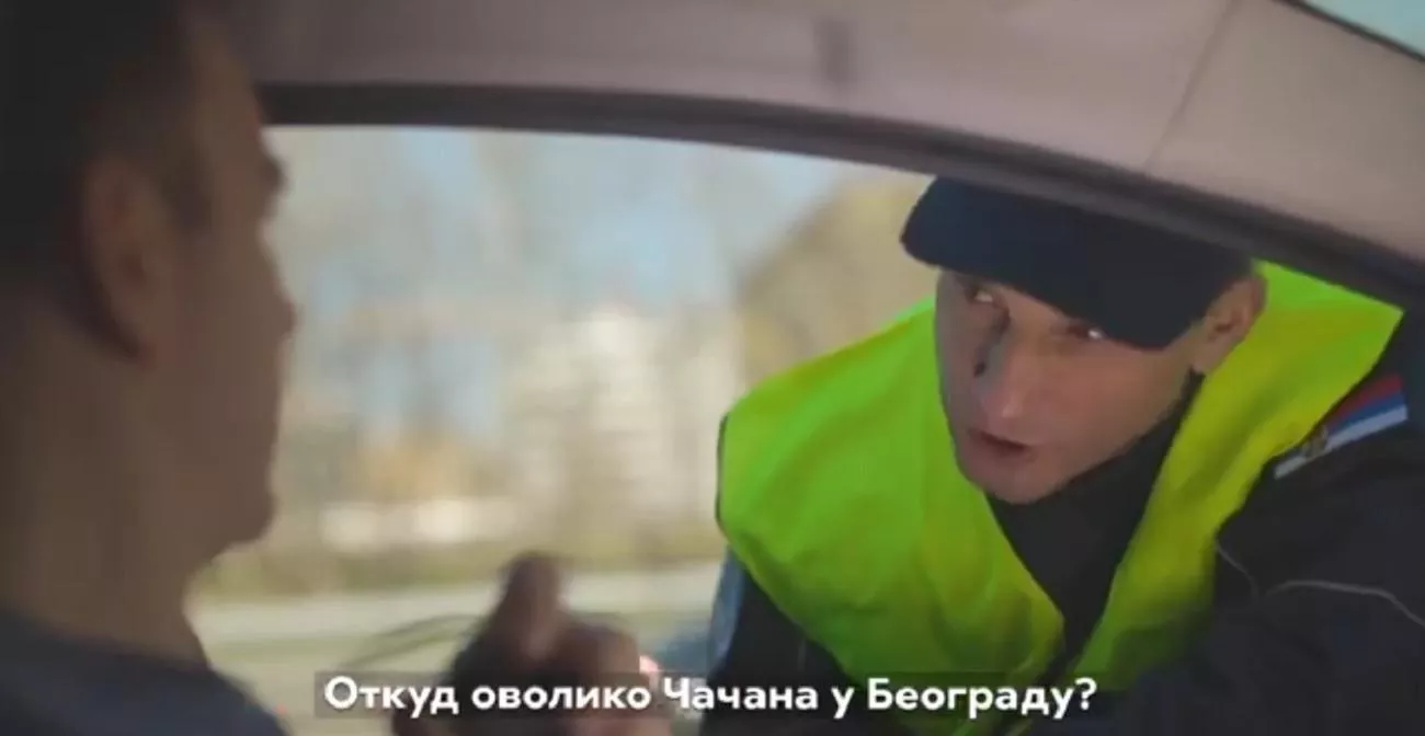 Prikazan je policajac koji putnike u automobilu pita pa zašto iz Čačka za Beohgrad samo na piće?