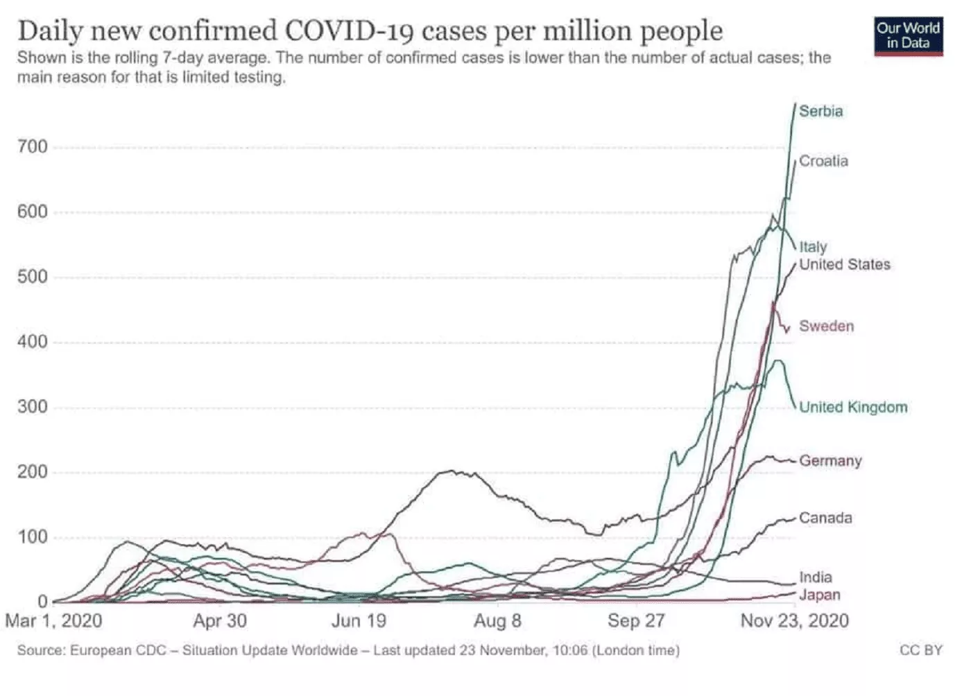 Naime, na društvenim mrežama masovno se deli grafikon koji prikazuje države prema broju novih slučajeva koronavirusa na dnevnom nivou na milion stanovnika od marta 2020. do novembra 2020. godine. Prema ovom grafikonu Srbija je u ponedeljak, 23. novembra bila prva među odabranih 10 zemalja