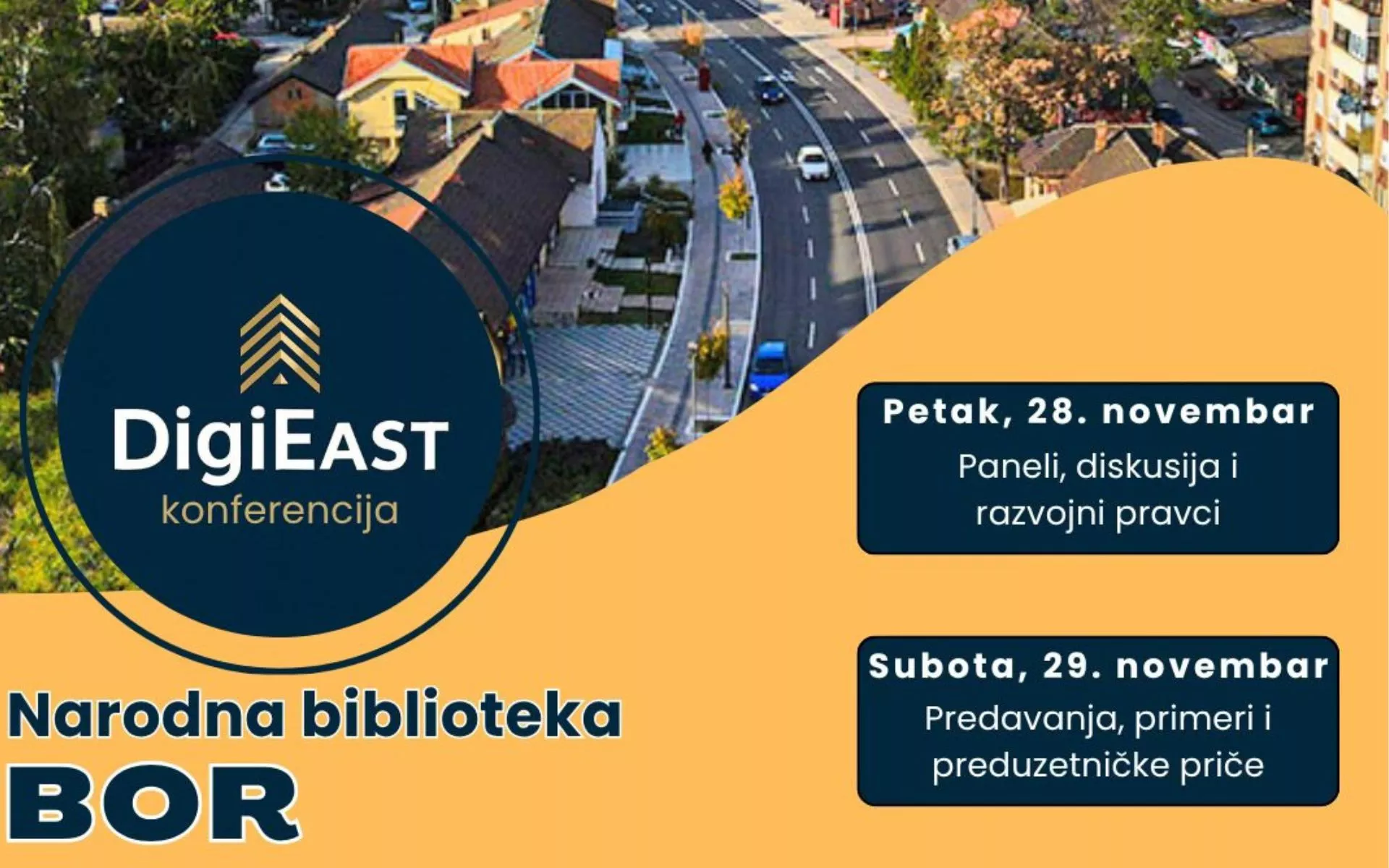 Biznis inkubator centar Bor, uz podršku Grada Bora i u saradnji sa Naučno-tehnološkim parkom iz Niša organizuje prvu DigiEast Biznis konferenciju u Boru, pod sloganom „Od ideje do biznisa! Vreme je da se ideje opet rađaju na istoku!“.Konferencija će biti održana u petak i subotu, 28. i 29. novembra 2025. godine u Narodnoj biblioteci Bor, sa početkom u 11h.