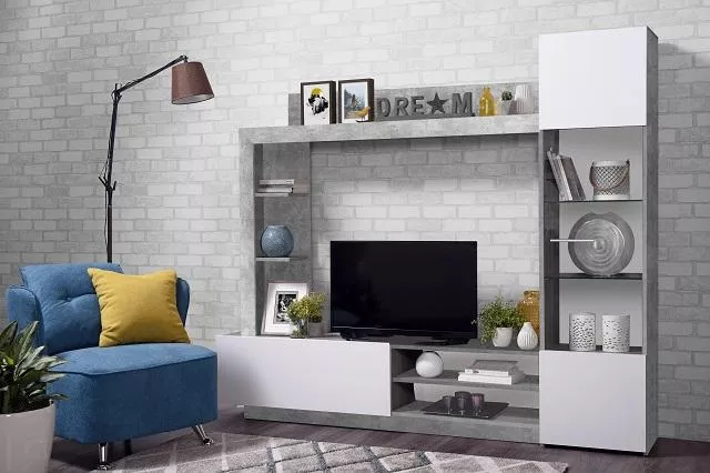 - Još jedna varijnta za uređenje dnevnog boravka je kombinacija regala TOTO, takođe u dekoru betona i bele, sa NEW YORK foteljom jarke boje. Ono što još više ovom enterijeru daje industrijski šmek je upravo i tapet sa aplikacijom cigle, kao i korišćenje rasvete koja podseća na stare, industrijske lampe.