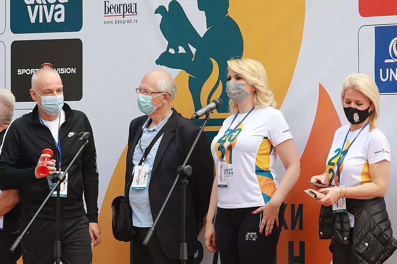 Znak za start trke ispred crkve Svetog Marka zajedno su dali predsednica počasnog odbora ministarka Darija Kisić Tepavčević, gradonačelnik Zoran Radojičić i član Kriznog štaba epidemiolog Predrag Kon, u društvu direktora maratona Dejana Nikolića.