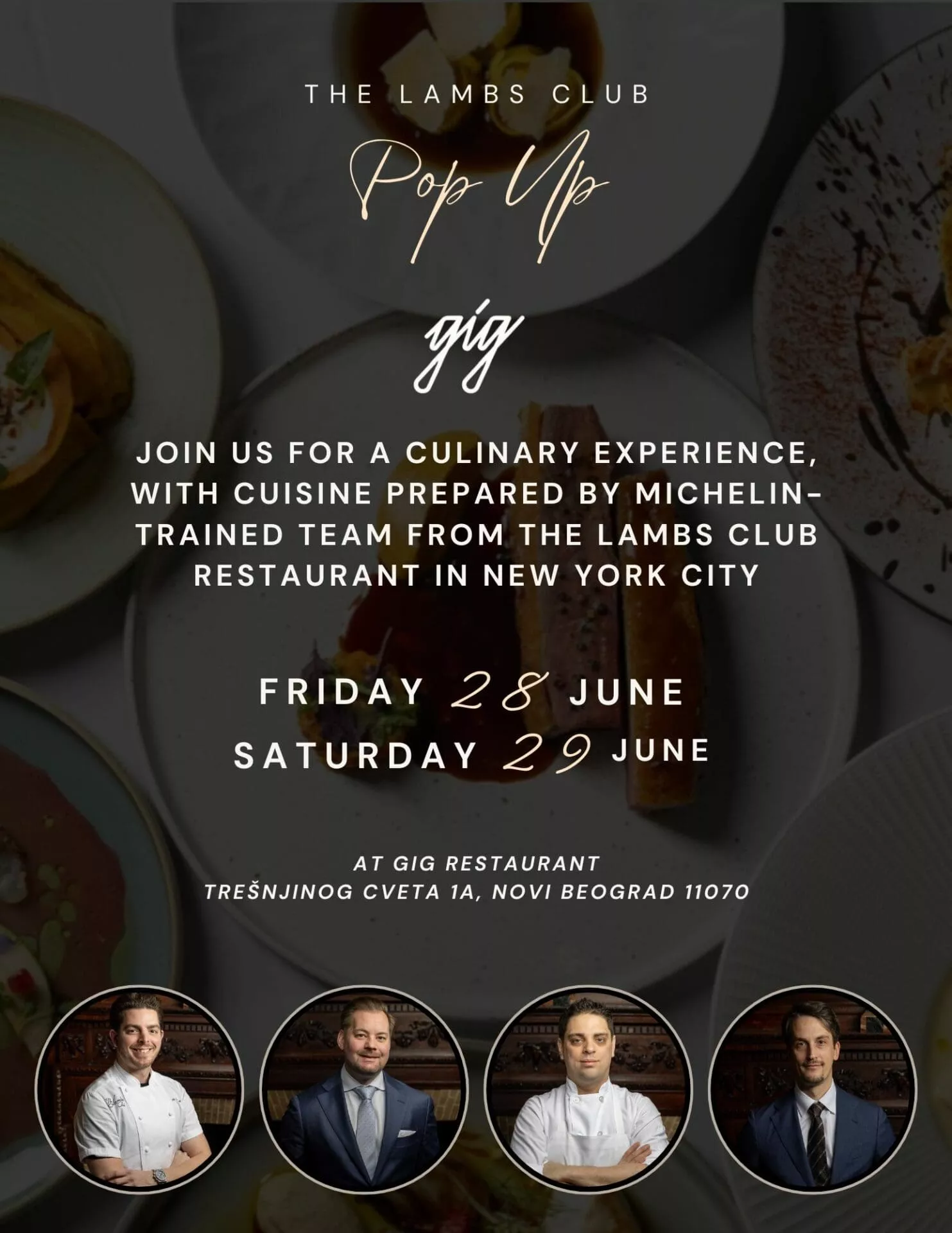 U elegantnom svetu fine dininga, restoran GIG, nosilac ekskluziviteta, hedonizma i vrhunskog ugostiteljskog umeća, krajem juna organizovaće ekskluzivno gostovanje dvojice najpoznatijih šefova kuhinje nagrađenih Michelin-ovim zvezdicama. U pitanju su Jack Logue i Jon James Vazques iz čuvenog njujorškog restorana The Lambs Club.