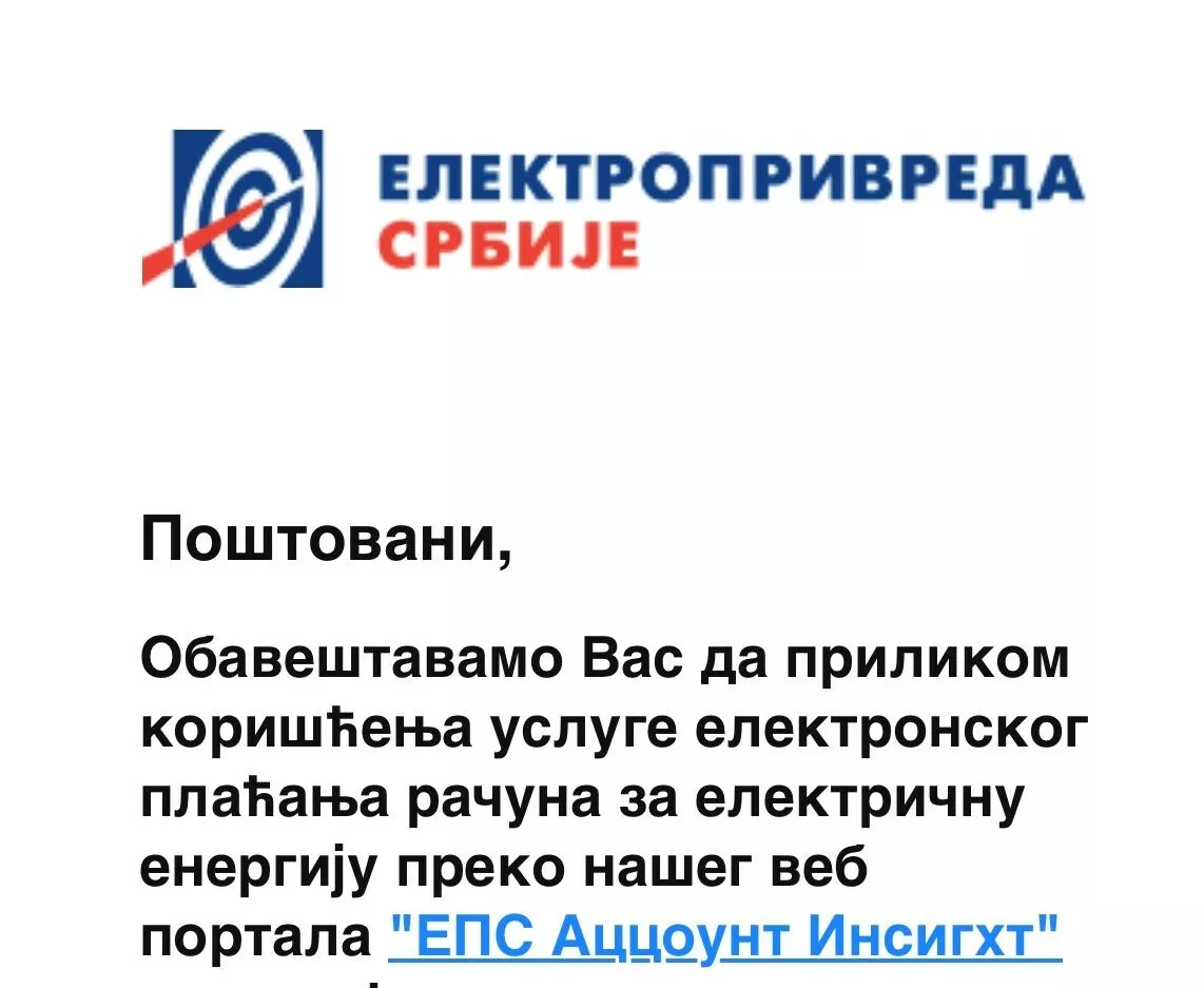 Akcionarsko društvo „Elektroprivreda Srbije“ obaveštava javnost da je na delu pokušaj prevare mejlovima u kojima je zloupotrebljeno ime, logo i naziv domena kompanije. EPS nikada kupcima ne šalje obaveštenja sa linkovima za plaćanja.