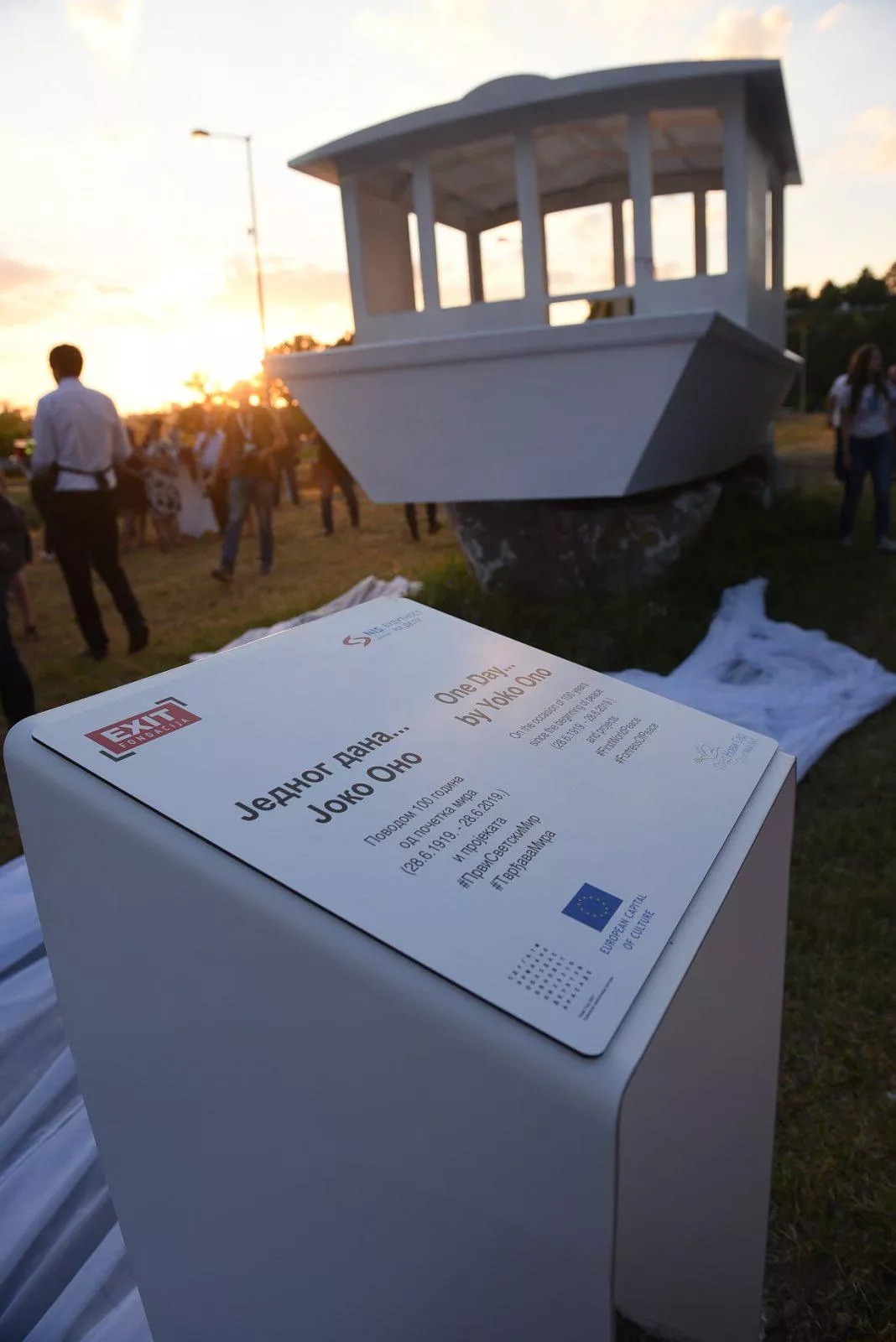 „Mir je moć! Mir na Zemlji, mir sa Zemljom“ – poručila je legendarna multimedijalna umetnica i aktivistkinja Joko Ono u video poruci kojom se obratila visokim zvanicama na večerašnjem, svečanom otvaranju njenog umetničkog rada „One Day…“ na Petrovaradinskoj tvrđavi u Novom Sadu. Ovo umetničko delo otkrili su članovi novosadskog dečijeg hora „Melodies“, i to simbolično na stogodišnjicu od potpisivanja Versajskog sporazuma 28. juna 1919. godine u Francuskoj, čime je zvanično i završen Prvi svetski rat. Američka umetnica, japanskog porekla, zajedno sa Exitom je spomenik posvetila Prvom svetskom miru, a njegov izgled inspirisan je tradicionalnim srpskim brodom, takozvanom „šajkom“. Nakon što je u svetu proslavljena kao mesto gde se održava EXIT festival, Petrovaradinska tvrđava dobiće novi zaštitni znak, a Novi Sad i Srbija novu kulturno-turističku atrakciju. Kada su uspostavili saradnju zahvaljujući zajedničkim kontaktima u svetskim muzičkim krugovima, Joko Ono i EXIT su osmislili ovaj projekat koji je realizovan uz podršku kompanije NIS, Evropske prestonice kulture i Novog Sada, grada mira, saradnje i kulture.