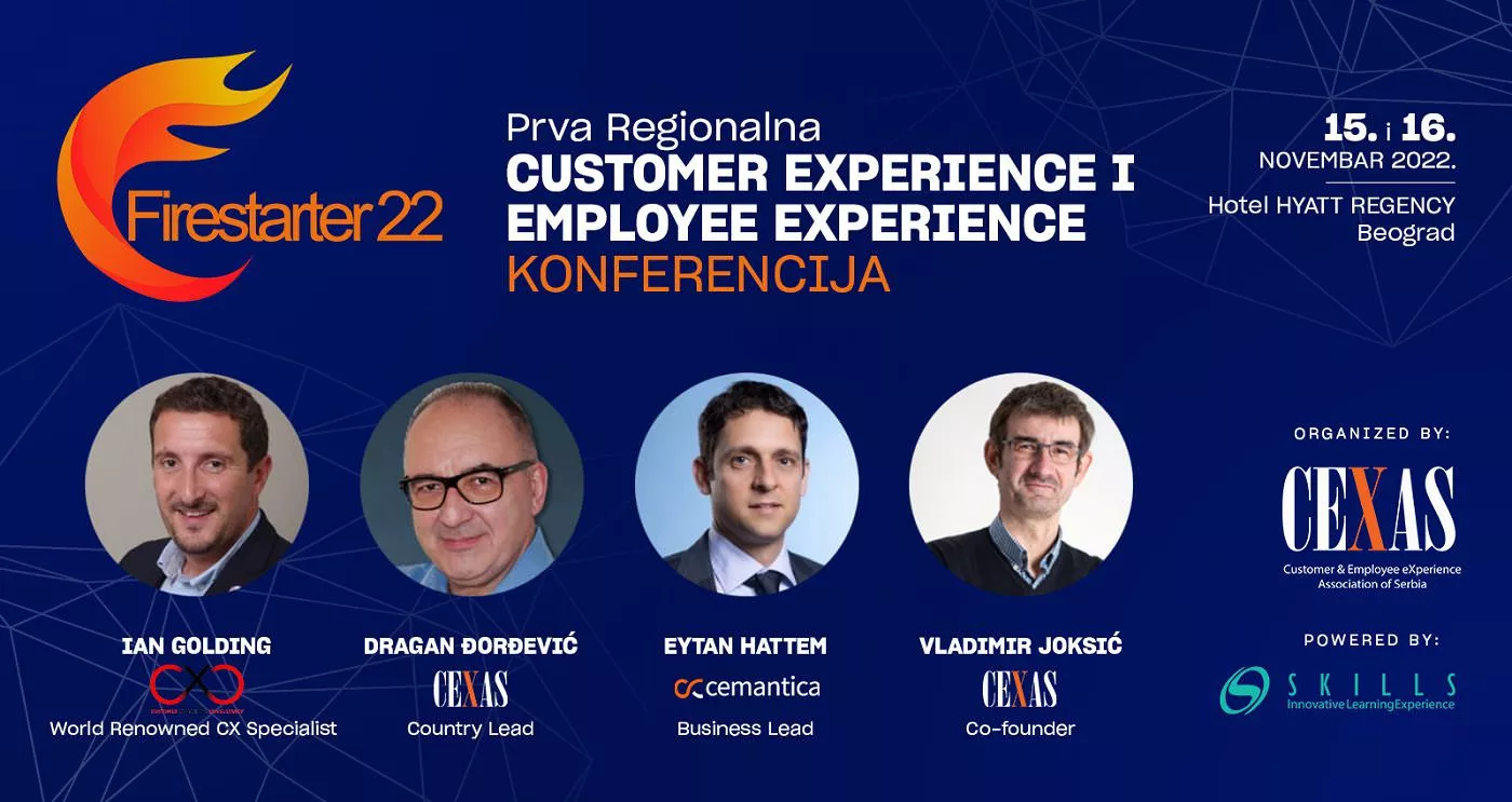 Prva regionalna konferencija sa temama Customer Experience i Employee Experience – FIRESTARTER 22 će se održati u Beogradu 15. i 16. novembra u hotelu Hyatt Regency i dovodi nam svetska imena iz oblasti naprednog i strateškog korisničkog iskustva i iskustva zaposlenih, a to su teme koje su danas preduslov za održivi rast kompanija.