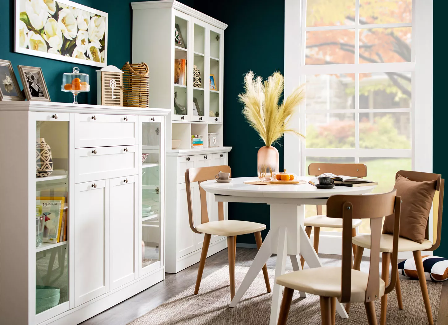 Za opremanje trpezarije, nikada nije na odmet imati više prostora za skladištenje dodatnog posuđa ili čaša, tako da dodavanjem vitrina različitih dimenzija, poput vitrine LANDWOOD 53 ili vitrine LANDWOOD 50 možete dobiti na funkcionalnosti prostora. Uz ove elemente bi se savršeno uklopio i trpezarijski sto ATRIA koji je takođe u belom drvo dekoru.