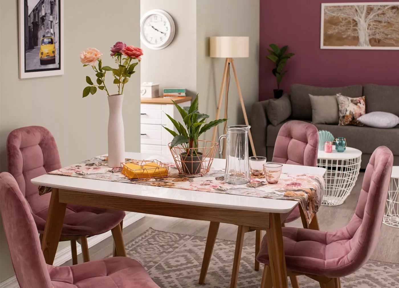 Roze boju možete primeniti na uređenju trpezarije, čime biste u ambijentu stvorili jaku, a opet ženstvenu atmosferu. Romantični ambijent možete upotpuniti roze trpezarijskim stolicama G603 sa dizajnom koji kombinuje štof i drvenu konstrukciju. Traka za trpezarijski sto u cvetnom dezenu mali je detalj koji će napraviti veliku promenu u izgledu ambijenta, a na ležaju u dnevnoj sobi možete dodati jastučnicu u istom dezenu. Vaza sa cvećem na stolu pravi je letnji detalj kojim ćete dodatno ukrasiti prostor.