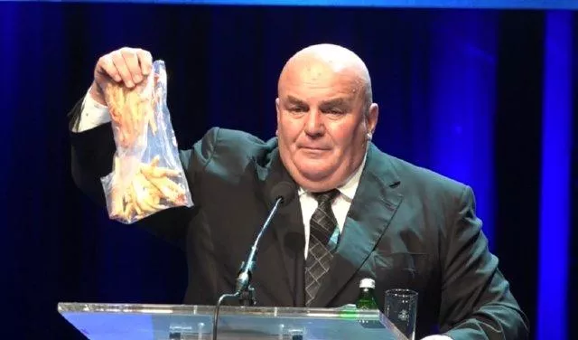 Obraćajući se na skupštini JS u Sava centru, kojoj su prisustvovali i njegovi koalicioni partneri, Aleksandar Vučić i Ivica Dačić, prvi čovek stranke i grada Jagodine, prvo je iskritikovao bivšu vlast opštužujući ih da su prodavali državne fabrike i preduzeća, a potom je „izvukao iz rukava“ kesu sa pilećim nogicama.