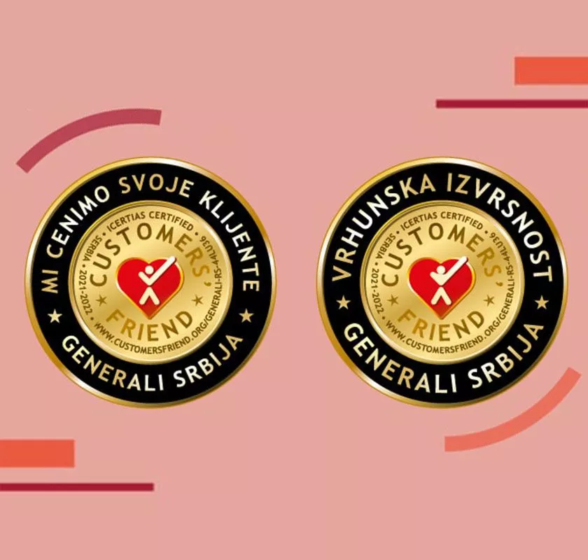 Generali Osiguranje Srbija je drugu godinu zaredom dobilo prestižne medalje „Mi cenimo svoje klijente” i „Vrhunska izvrsnost” za izvanredan odnos sa klijentima i saradnicima. Medalje dodeljuje međunarodna organizacija ICERTIAS u sklopu programa „Prijatelji klijenata”.