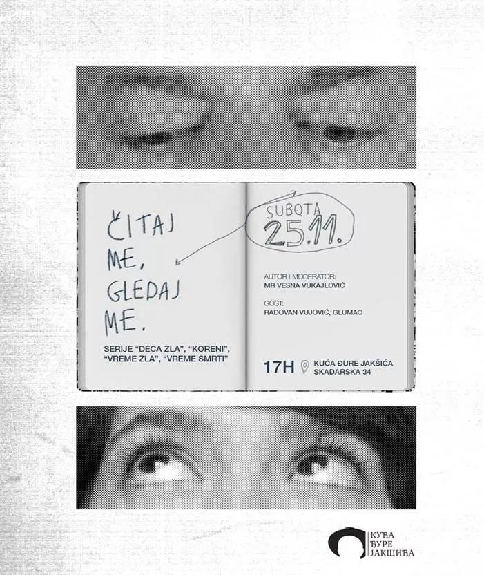 U okviru novembarske tribine „Čitaj me, gledaj me“ u Kući Đure Jakšića moderatorka Vesna Vukajlović ugostiće glumca Radovana Vujovića, a biće reči o serijama „Deca zla“, „Koreni“, „Vreme zla“, i „Vreme smrti“.