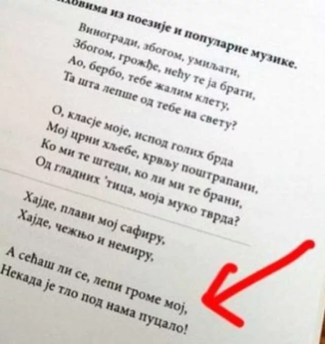 Podsetimo, radna sveska u kojoj je naveden pomenuti stih u jednom zadatku kao primer popularne muzike odobrena je još 2014. godine, a nedavno je bez ijedne primedbe i drugo izdanje dobilo „zeleno svetlo“ stručnjaka ZUOV-a.