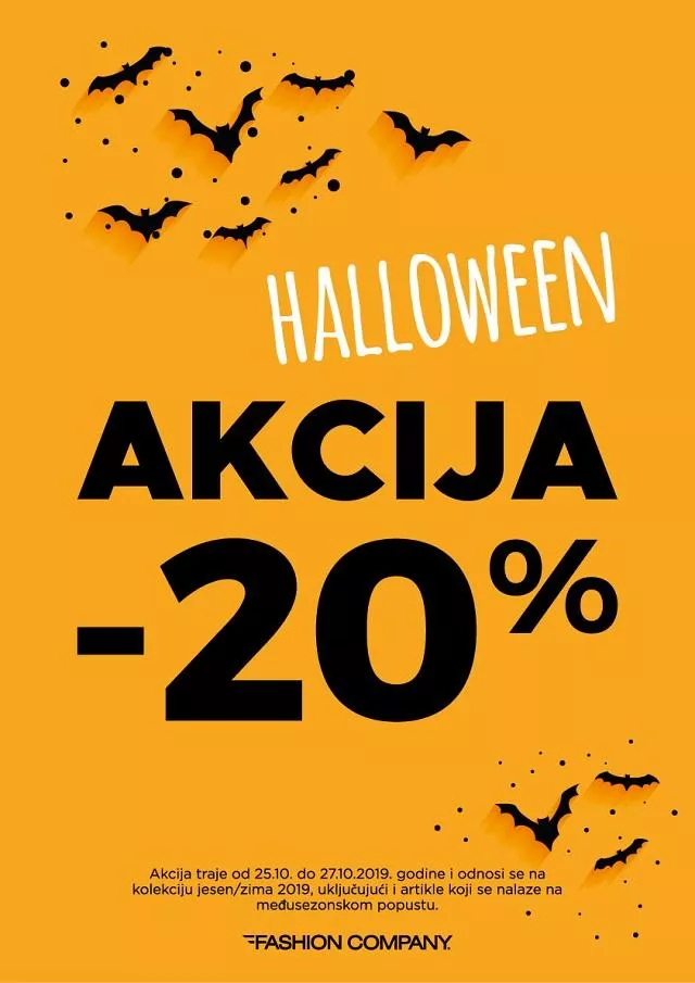 Pripremite se za šoping avanturu ovog vikenda, uz specijalnu HALLOWEEN akciju u svim prodavnicama Fashion Company. Samo od 25. do 27. oktobra možete da ostvarite 20% popusta na kolekciju jesen/zima 2019. Akcija se odnosi i na artikle koji se već nalaze na međusezonskom popustu.