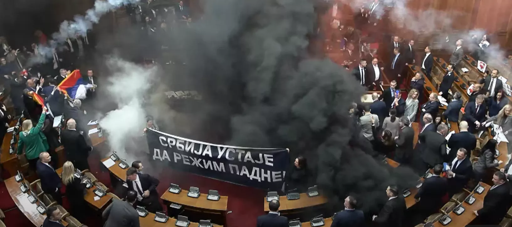 U skupštinskoj sali aktivirane su dimne bombe, upaljene baklje, a opozicija je razvila transparent „Srbija ustaje da režim padne“. Poslanici vlasti opoziciji uzvraćaju povicima „Ustaše“ i drže srpske zastave. Gađaju se flašicama vode, a jedna poslanica je pogođena u glavu. Sala je puna dima. Brnabić jedva govori od dima i poziva poslanike većine da se vrate u klupe poručuje ova skupština će nastaviti da radi.