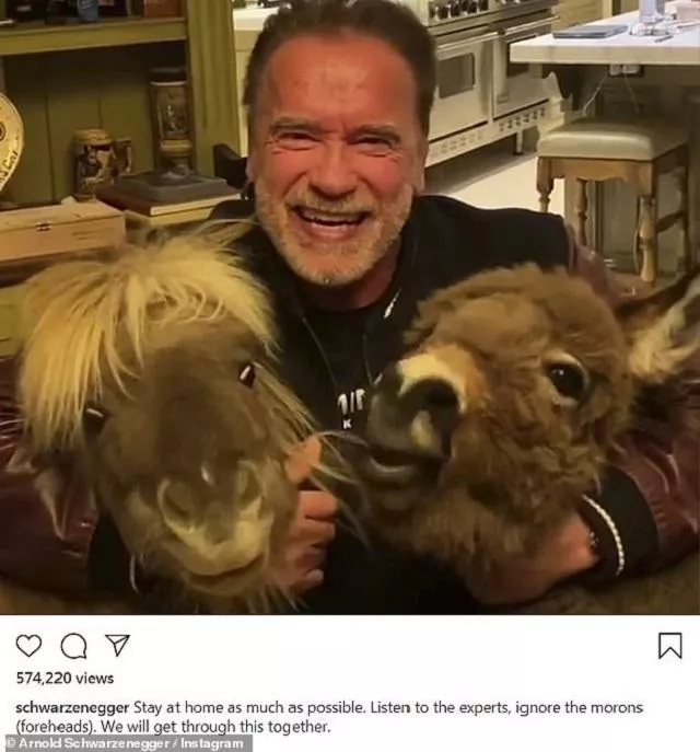 Arnold Švarceneger ima 72 godine i spada u rizičnu grupu kada je u pitanju koronavirus. Glumac je shvatio ozbiljnost situacije i pozvao sve da ostanu kod kuće. „Ne izlazimo iz kuće, ne idemo u restorane, samo jedemo od kuće. Zaboravite restorane, javna okupljanja…Ostanite kod kuće,“ poručuje Švarceneger hraneći šargarepama svoja dva ljubimca.
