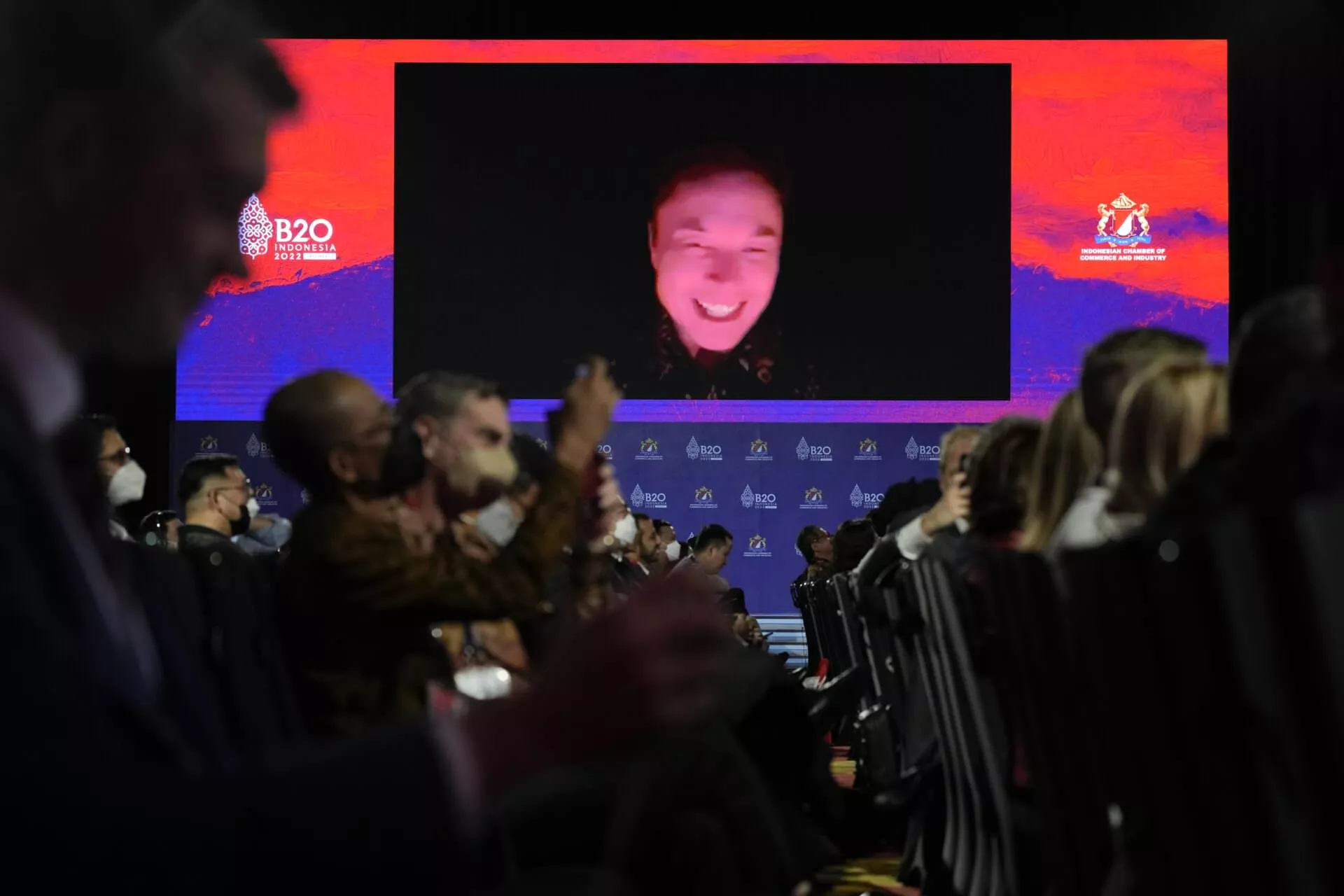 Tesla CEO Elon Musk talks virtually at the B20 Summit ahead of the G20 leaders summit in Nusa Dua, Bali, Indonesia, Monday, Nov. 14, 2022. (AP Photo/Aaron Favila)