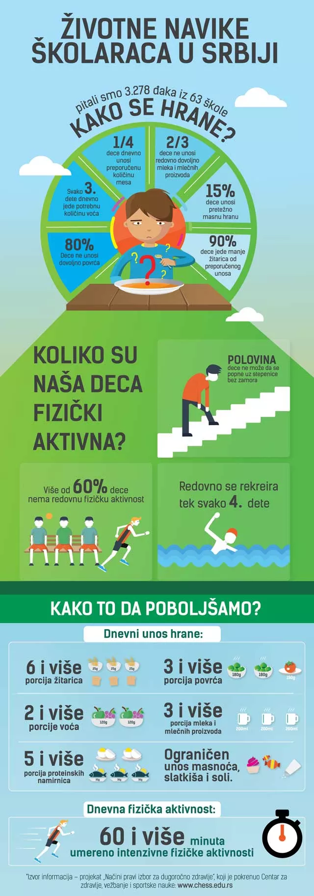 Usled nedovoljne fizičke aktivnosti i loše ishrane gotovo polovina dece  ima problem da se popne stepenicama do drugog sprata, jedan je od klučnih rezultata prve faze istraživačko-edukativnog projekta “Načini pravi izbor za dugoročno zdravlje”.  Prema istraživanju, 80 odsto dece ne unosi dovoljno povrća, svako treće jede preporučenu količinu voća, samo trećina dece unosi dovoljno mesa, a gotovo nijedno dete ne unosi dovoljno žitarica. Svega trećina dece konzumira dovoljne količine mleka i mlečnih proizvoda, 15 odsto pretežno jede masnu hranu a više 60 odsto nema nikakve redovne fizičke aktivnosti.