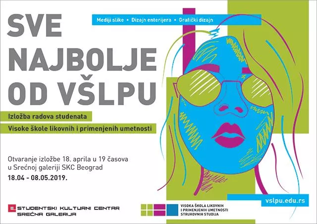 Izložba Sve najbolje od VŠLPU u Srećnoj galeriji SKC-a predstavlja izbor najboljih radova studenata Visoke škole likovnih i primenjenih umetnosti strukovnih studija iz Beograda u školskoj 2018/2019 godini.