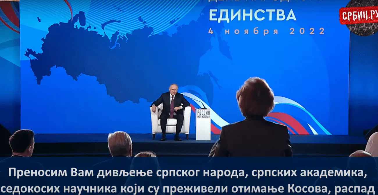 Društvenim mrežama širi se snimak skupa na kom je bio ruski predsednik Vladimir Putin koji je razgovarao sa istoričarima i verskim poglavarima u Moskvi na dan Narodnog jedinstva. Skupu je prisustvovala i ruska istoričarka Natalija Aleksejeva Naročnicka koja je nedavno boravila u Beogradu i koja je pred Putinom prenela, kako kaže, poruku Srba.