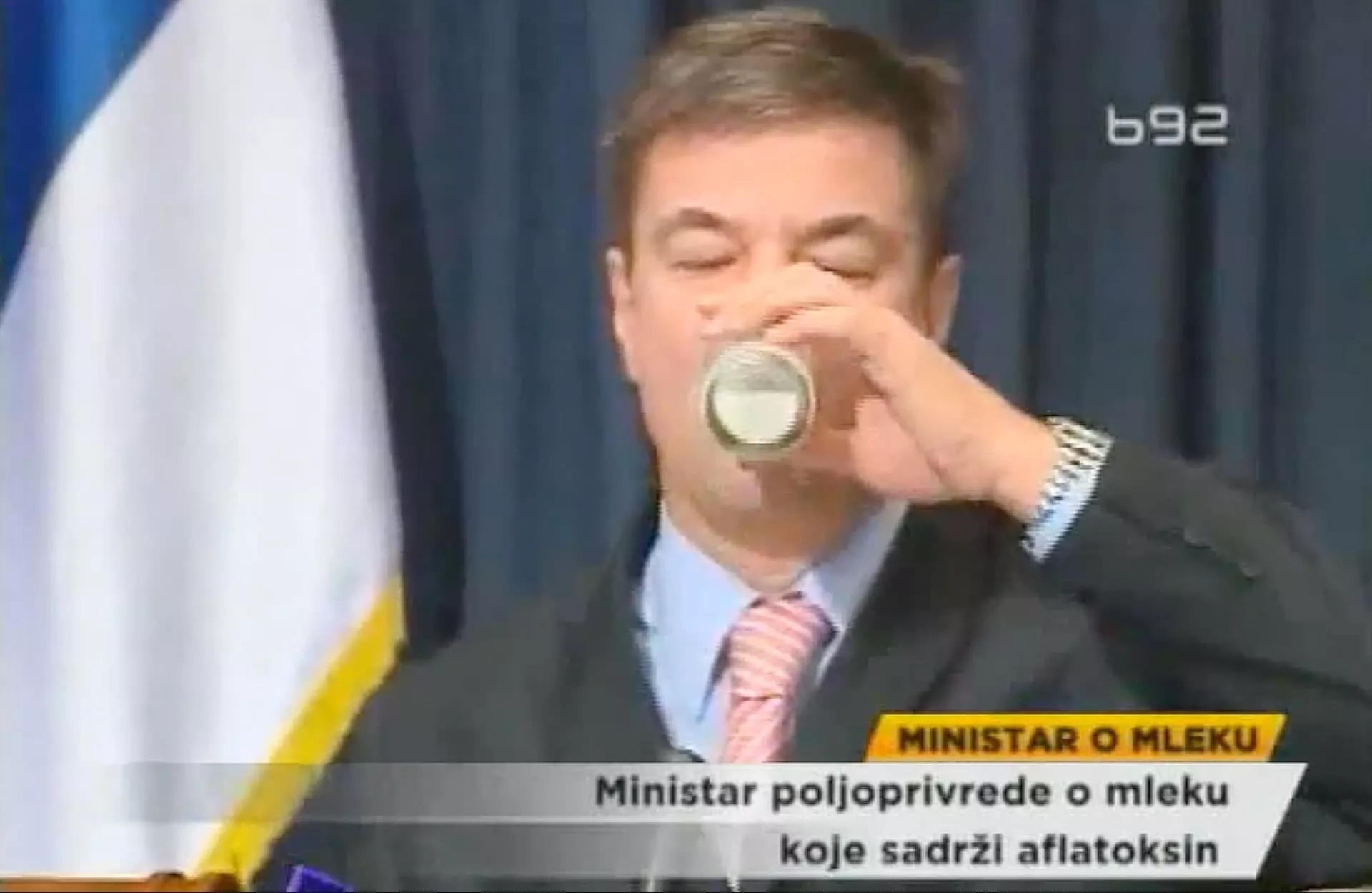 Reč je o bivšem ministru poljoprivrede Goranu Kneževiću koji je, da bi dokazao da je mleko u Srbiju bezbedno za upotrebu, na konferenciji za novinare ispio čašu mleka, dok su ispred njega stajala pakovanja različitih proizvođača.