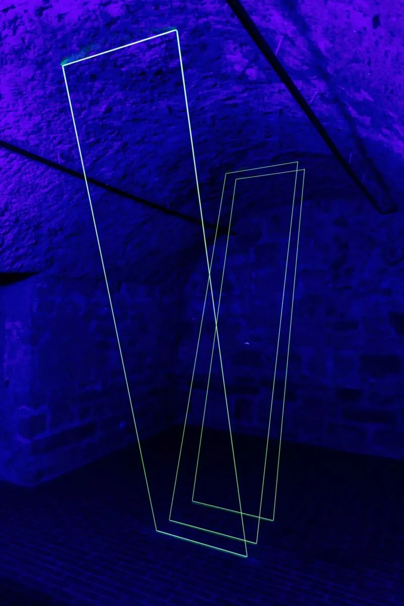 „Geometrija praznine“ nastavlja umetnički dijalog o odnosima tela, prostora i čulnog iskustva. U središtu izložbe nalazi se ambijentalna svetlosna instalacija Faraway, so close, smeštena u podrum KCS, koja otvara prostor van jezika – tiho, senzorno polje u kojem dolazi do frekvencijske ravnoteže između vidljivog i nevidljivog.