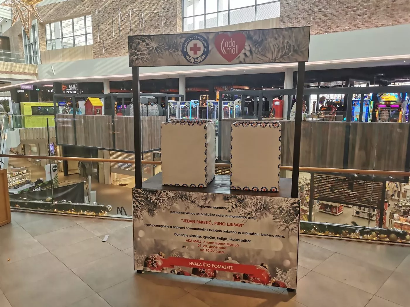 Pozivamo vas da prililkom posete Ada Mallu, na trećem spratu isred prodavnice MAXI, donesete slatkše, igračke, knjige i školski pribor u vremenu od 10 do 22 časa. Akcija traje do 20. decembra kada će biti formirani paketići i dodeljeni najugroženijima.