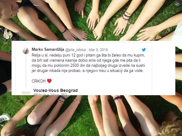 „Ćao Marko! Pošto smo videli tvoj tvit, želeli bismo da obradujemo Relju i njegovog druga – naš restoran Voulez-Vous Etage njima dvojici poklanja sushi u čast rođendana!“.