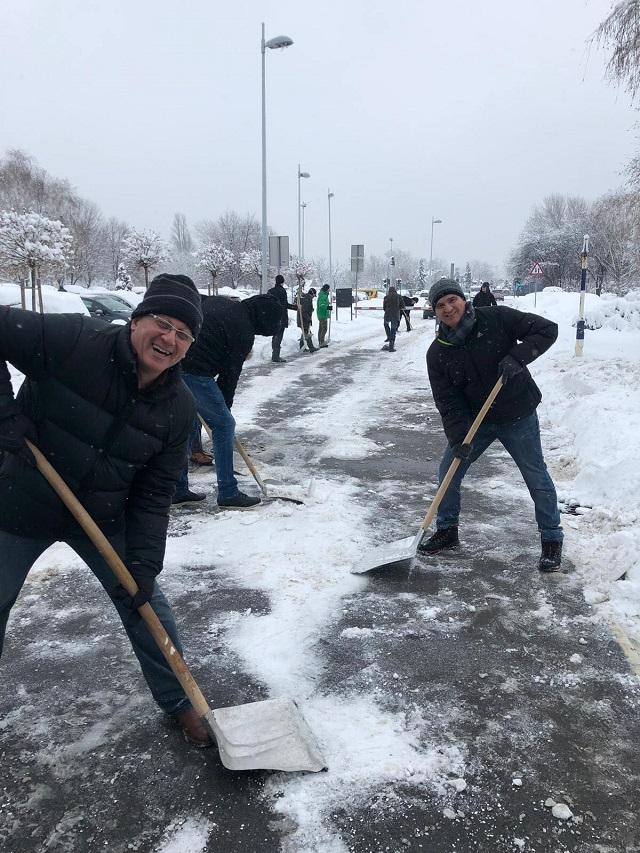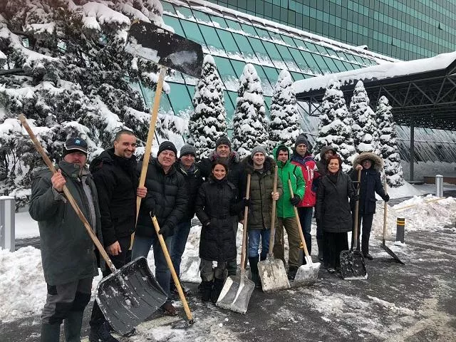 Svi zajedno, od kuvara do direktora, uzeli su lopate u ruke i potpuno očistili prilaz tom hotelu. Sudeći po osmehu, moglo bi se reći da je „tim bilding“ za ovu godinu uspeo.