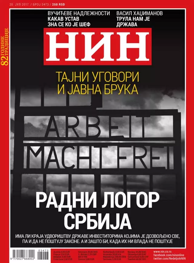 Danas je izašao novi broj NIN-a, a na naslovnoj strani nalazi se fotografija nacističkog logora sa natpisom “Arbeit macht frei“ (Rad oslobađa) i naslovom “Radni logor Srbija“. Naslovna strana prati tekst u kome se govori o odnosu države i investitora gde je, kako se navodi „investitorima dozvoljeno sve, pa i da ne poštuju zakone“.