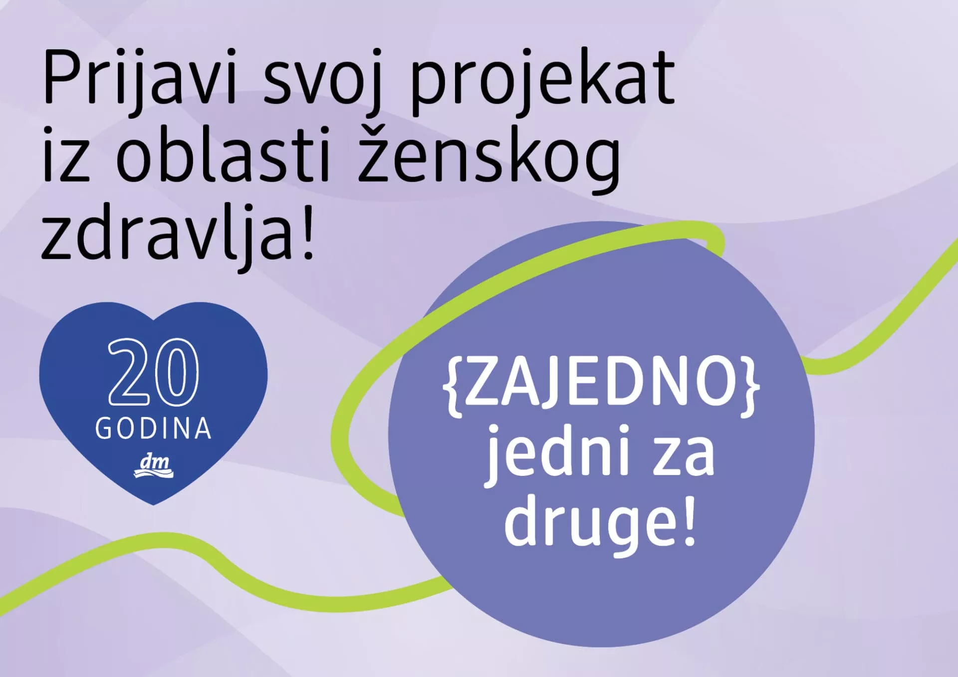 Kompanija dm će u okviru sveobuhvatne kampanje posvećene zdravlju žena podržati one koji ispunjavaju postavljene kriterijume i pružaju najviše dobrobiti za zajednicu, s fokusom na projekte primarno usmerene na podsticanje zdravijeg načina života i prevenciju nastanka bolesti koje pogađaju žene, inicijative za podršku ženama, za fizičko, mentalno i menstrualno zdravlje žena, zdrav način starenja, kao i inovacije i edukacije povezane s tim.
