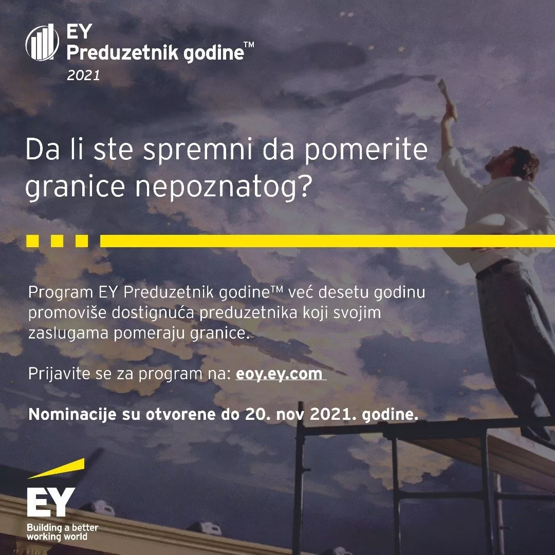 Revizorsko – konsultantska kompanija EY (Ernst&Young) desetu godinu zaredom otvorila je konkurs za program EY Preduzetnik godine™ koji će trajati do 20. novembra 2021. godine.