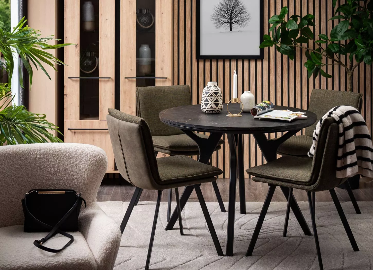 Fokusni element u trpezariji je trpezarijski sto, a trpezarijski sto FOKUS predstavlja pravo rešenje za funkcionalan i estetski privlačan prostor. Pored stola, neizostavni komad je naravno trpezarijska stolica, a zanimljiv dizajn i udobnost trpezarijske stolice FLYNN bili bi dobitna kombinacija. Sedište je u maslinasto zelenom štofu, dok su nogari od crnog metala, pa je cela kompozicija atraktivna i po pitanju boja i materijala. Za upotpunjavanje enterijera, dobro bi došao komad nameštaja poput vitrine SARDINIA 2K VS2 zbog dodatnog prostora za skladištenje omiljenih čaša, vaza, svećnjaka i svega drugog što u trpezariji može zatrebati.