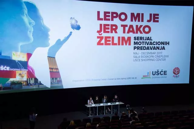 UŠĆE Shopping Center pokreće serijal motivacionih predavanja pod nazivom „LEPO MI JE, JER TAKO ŽELIM“ u saradnji sa Centrom za lični razvoj „Lepo mi je“, u nameri da svojim posetiocima ponudi novi i drugačiji sadržaj. Predavanja će se održavati jednom mesečno u periodu od maja do decembra ove godine u sali bioskopa Cineplexx UŠĆE Shopping Center. Kroz zanimljive i korisne životne teme, publiku će, iz svog ugla, motivisati i inspirisati poznate ličnosti, prepoznatljive po značajnim ostvarenjima u svom životu i poslu.
