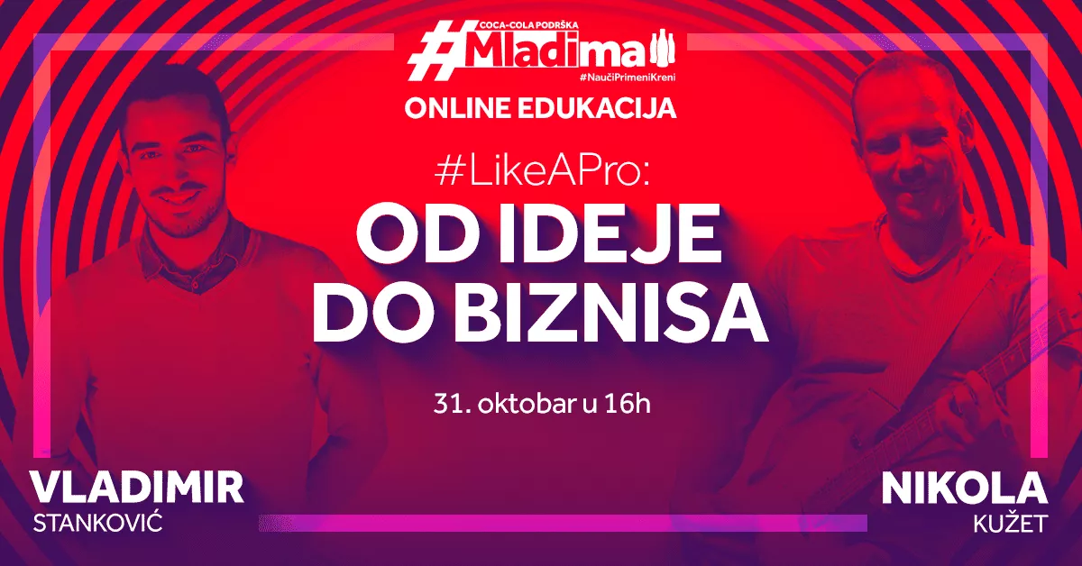 Imate ideju za biznis, ali ne znate da li je dobra i kako uopšte da je pretočite u konkretan posao? Ili ste na početku karijere ili novom poslu i značili bi vam saveti iskusnih ljudi iz korporacija i privatnog sektora? Baš za vas Coca-Cola podrška mladima organizuje predavanje pod nazivom “#LikeAPro: Od ideje do biznisa”, koje se u online formatu realizuje u ponedeljak, 31. oktobra u 16 časova.
