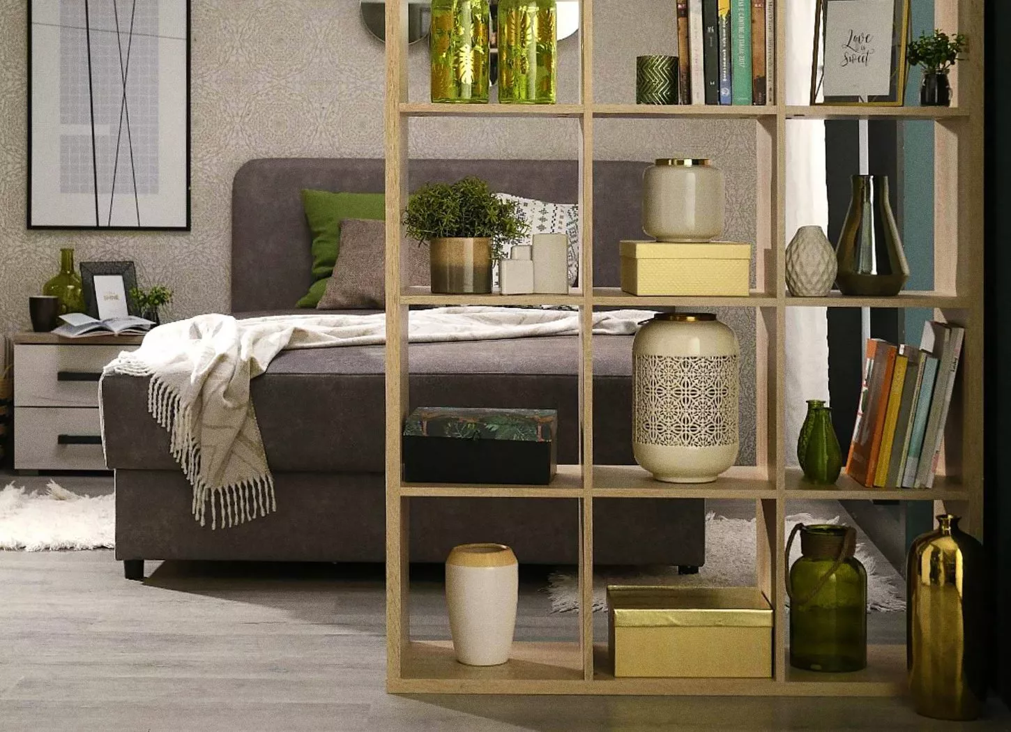 Ukoliko živite u garsonjeri, spavaći deo možete odvojiti čvrstom policom za knjige, a sjajno rešenje su samostojeće police za knjige, poput otvorene police Mauro sa kvadratnim pregradama. Stvaraju fizičko i vizuelno razdvajanje prostora, dok istovremeno služe za odlaganje knjiga i dekoracije, a njihov dizajn omogućava svetlosti da slobodno prolazi.