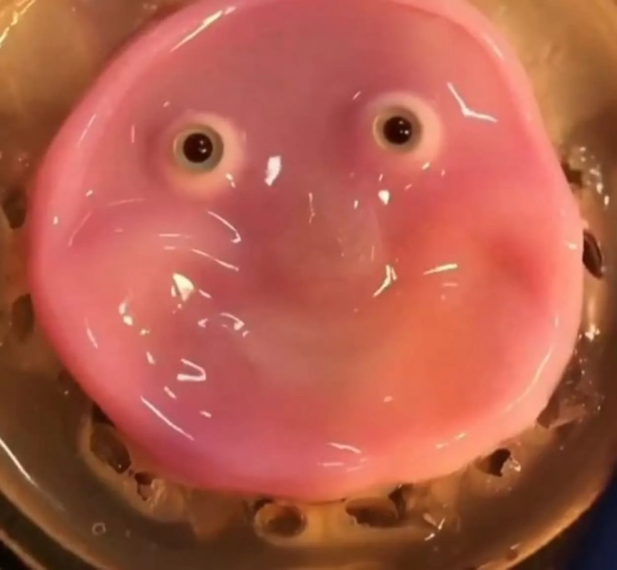 Mekana, ružičasta mrlja gleda u kameru svojim čudnim očima i osmehuje se, što se vidi po rupicama koje se formiraju na njoj.