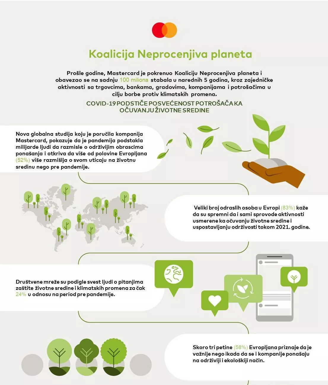Novo istraživanje o održivosti kompanije Mastercard otkriva značajan porast posvećenosti potrošača očuvanju životne sredine kao rezultat pandemije COVID-19. Više od dve petine ispitanih Evropljana (48%) smatra da je smanjenje njihovog ugljeničnog otiska sada važnije nego pre pandemije. Zapravo, više od polovine Evropljana (52%) postalo je svesnije toga da njihovi postupci mogu uticati na okolinu, a generacija Z i milenijalci (58%) prednjače u tome. Ovo signalizira rastući trend ka ekološki osveštenoj potrošnji među ljudima koji svoju kupovinu i korišćenje programa nagrađivanja pretvaraju u akcije u korist planete.