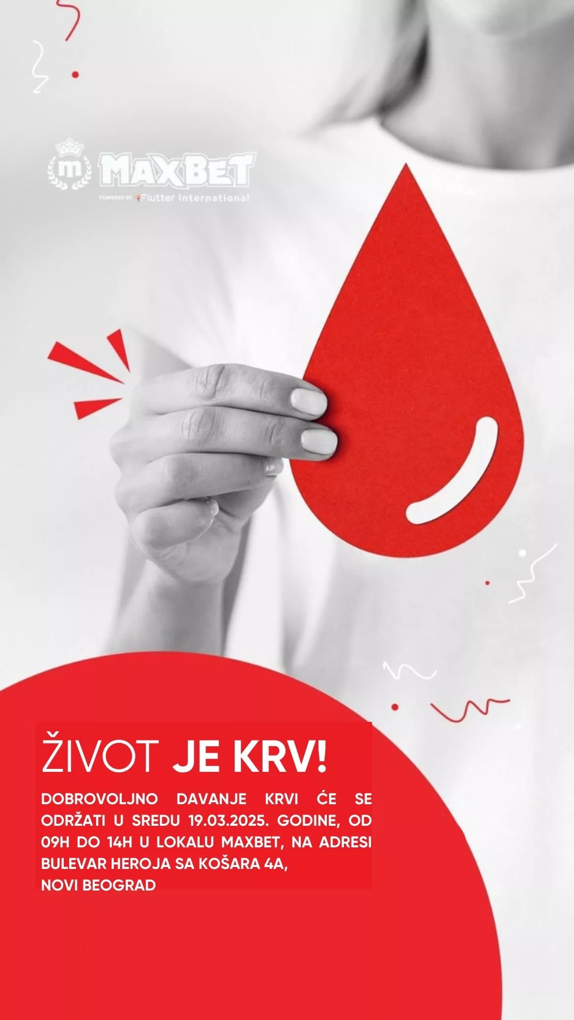 Kompanija MaxBet i Fudbalski klub Partizan pozivaju sve humane građane da se pridruže akciji dobrovoljnog davanja krvi pod nazivom „Život je krv“, koja će se održati u sredu, 19. marta, u periodu od 9 do 14 časova, na MaxBet kafeu, Heroja sa Košara 4a, Novi Beograd.