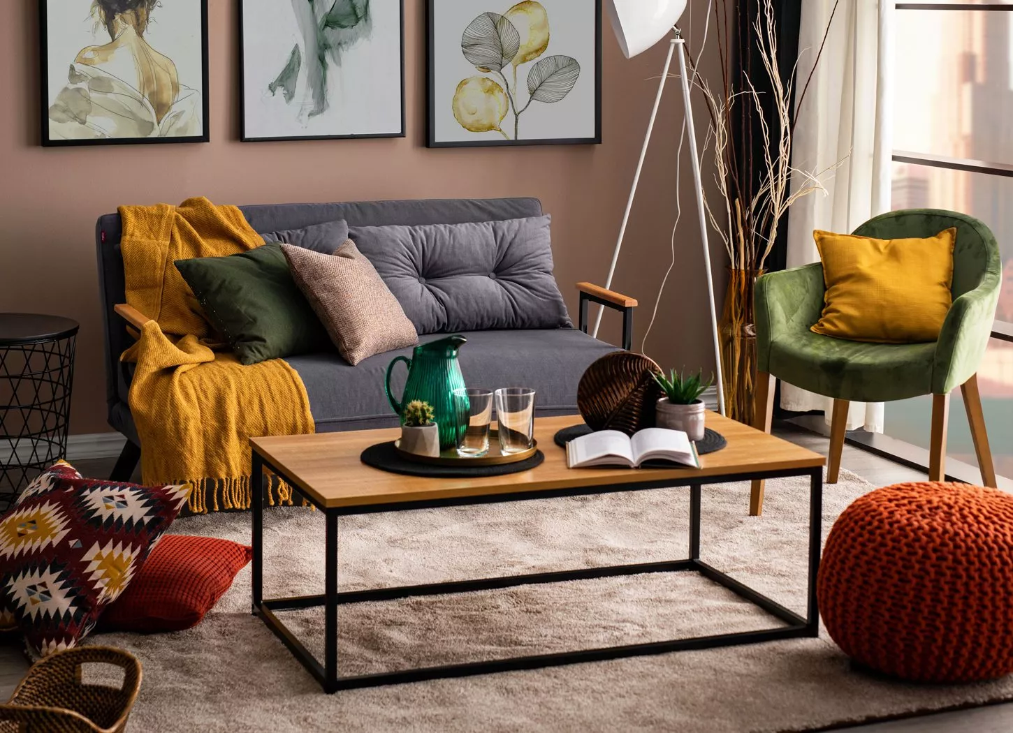 Metal i drvo dekor mogu pružiti i topao i moderan izgled, posebno kada se izaberu slične završne obrade. Stolica na ljuljanje YOKA upravo je takva kombinacija metala i drvo dekora, a štof u žutoj boji unosi dodatnu toplinu u ambijent dnevnog boravka. Dodatni elementi u prostoru mogu biti i zidne police VKS-80052 i VKS-80026 od metalnih kontrukcija, koje će estetski doprineti izgledu ambijenta, ali istovremeno i poslužiti za odlaganje dekoracije i sitnica.