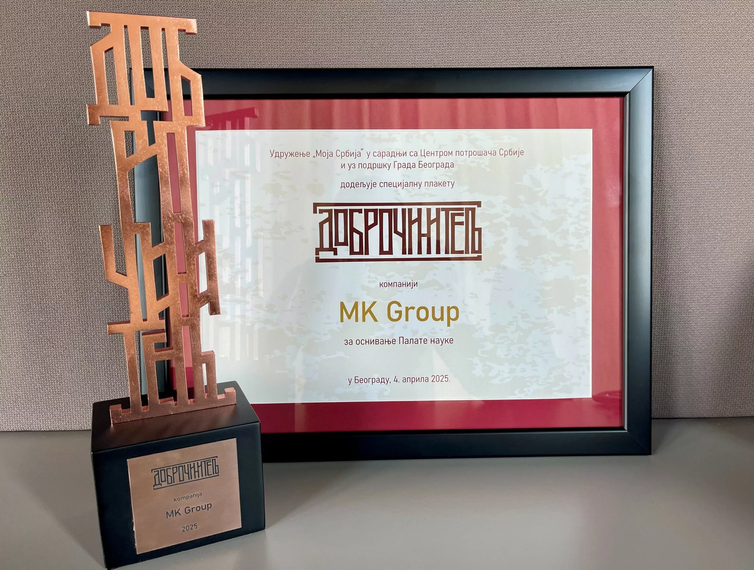 Kompanija MK Group dobitnik je ovogodišnje specijalne nagrade „Dobročinitelj” za projekat Palata nauke. Priznanja su dodeljena u okviru humanitarnog festivala BelgrAID, u organizaciji udruženja Moja Srbija, koji kroz umetnost, muziku i edukaciju promoviše filantropiju i zajedništvo.