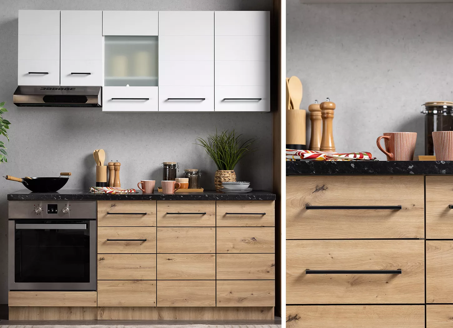 Ukoliko težite moderno uređenom enterijeru, onda su elementi kontrasta neizostavni, a idealan izbor za vas je kuhinja RAJNA 200. Kombinacija opak belog drvo dekora i crne mat folije kreiraće vizuelni kontrast, i vaša kuhinja će postati glavna zvezda modernog, monohromatskog enterijera. Pored estetike, ova kuhinja pruža i optimalan raspored upotrebnog prostora – gornje zatvorene pregradne delove i jedan zastakljeni segment, kao i donje zatvorene delove, uključujući segment sa fiokama. Ovaj model dolazi bez sudopere, slavine i radne ploče, čime omogućava personalizaciju prostora. Sigurno je da će odabir odgovarajuće dekoracije podići izgled vaše kuhinje na viši nivo. Tako svoju novu kuhinju možete opremiti kuhinjskim priborom i dekoracijom poput veštačke trave u pletenoj korpi, držačem za salvete ili dezertnim tanjirima.